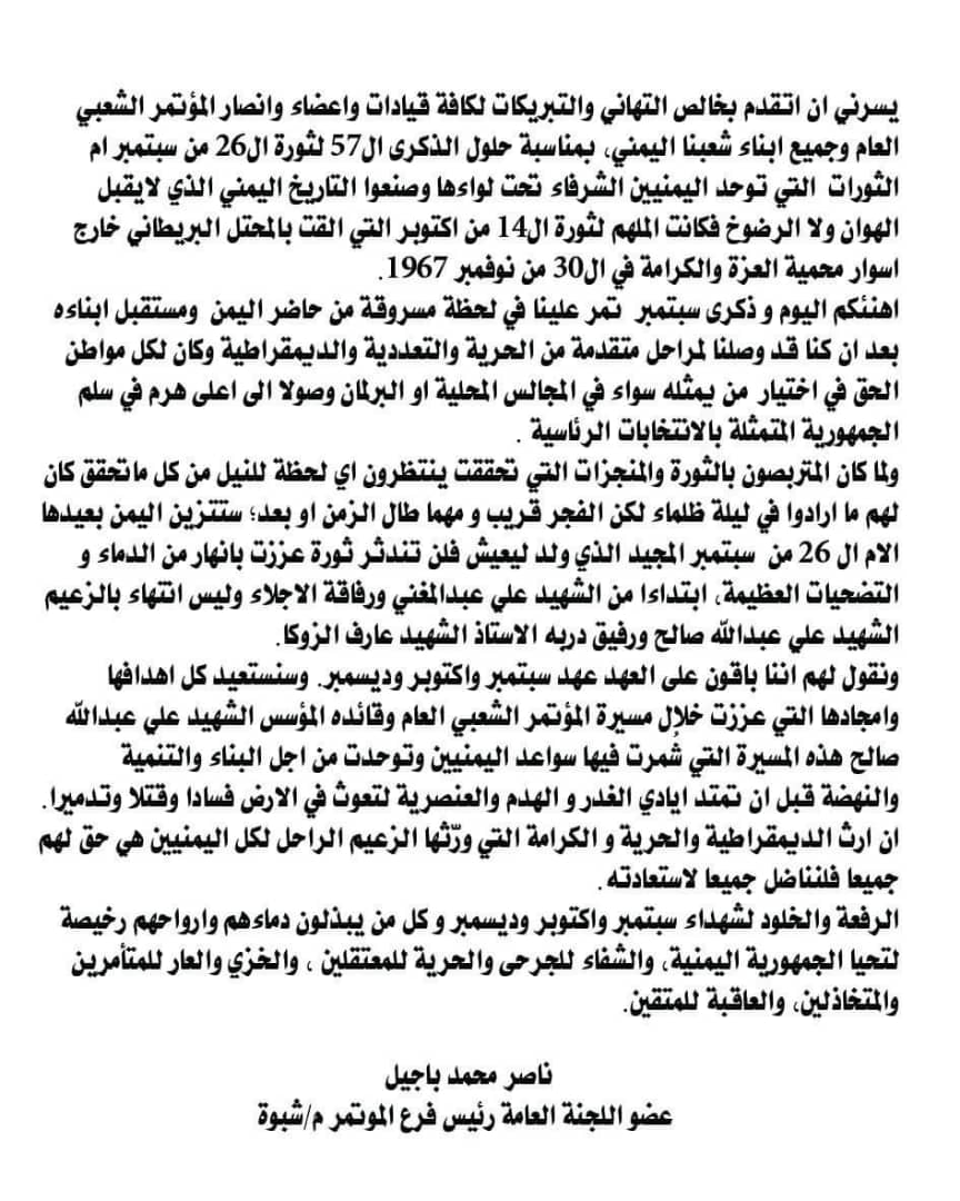 جاء ذلك في تهنئتة للشعب اليمني بذكرى ثورة السادس والعشرين من سبتمبر المجيد